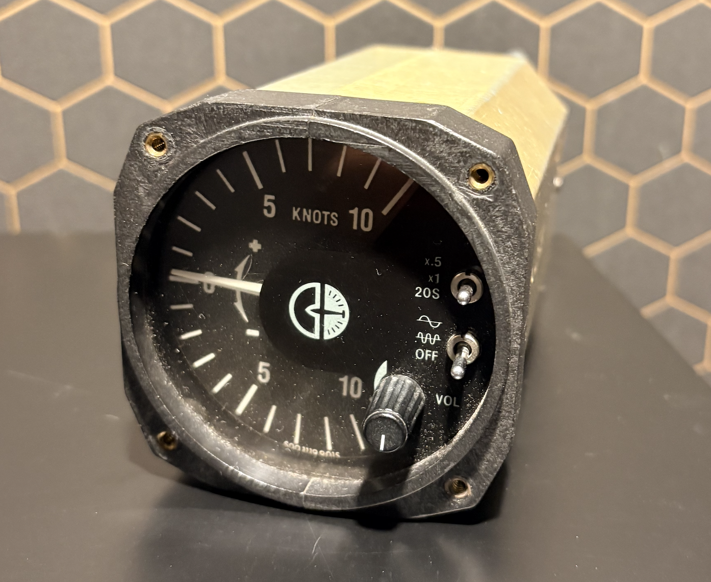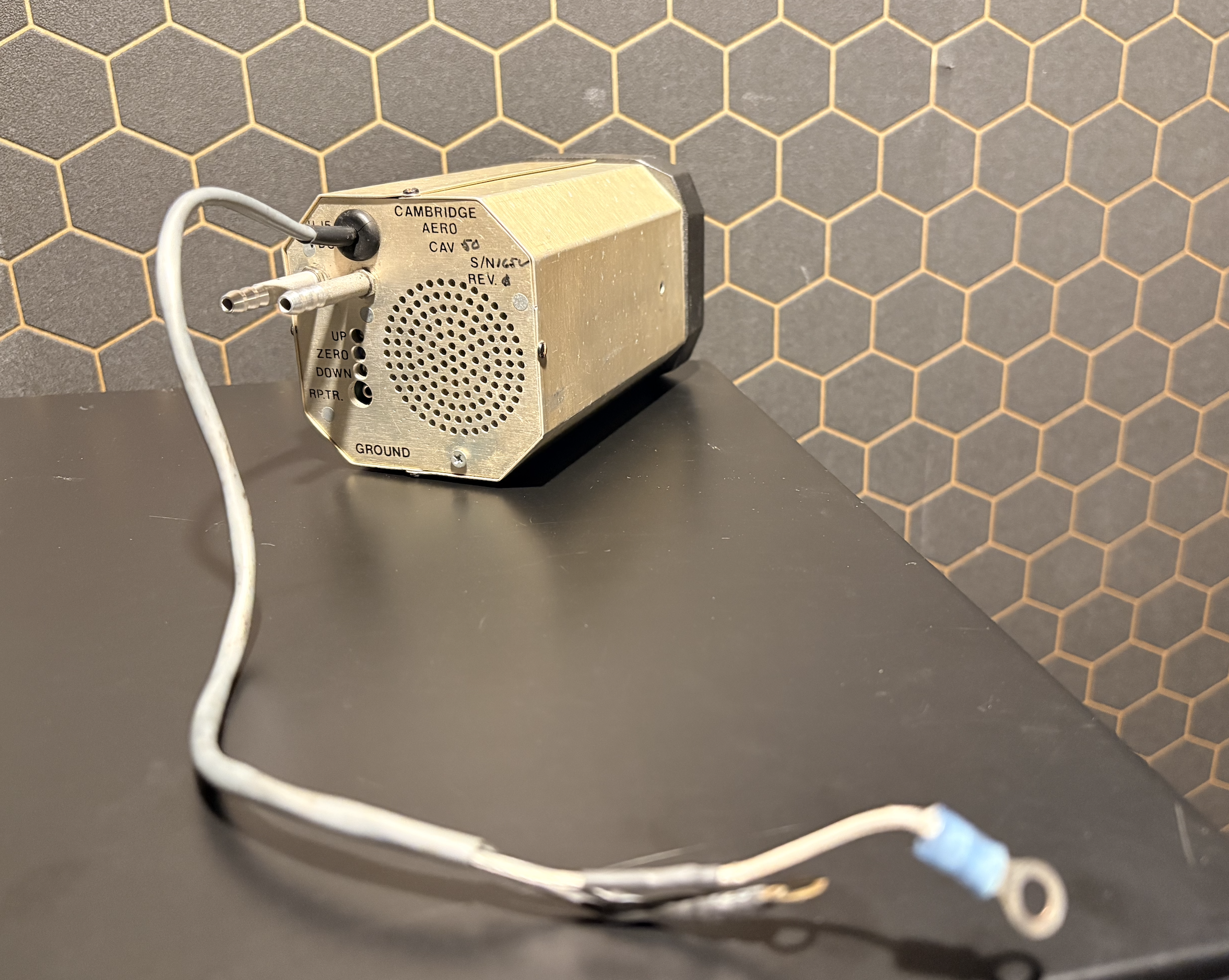 Analog needle display calibrated in knots (approx. ±10 kt range), with built-in audio, volume control, and audio filter/response selector. Rear-mounted speaker and standard pneumatic connections. Well-known, reliable Cambridge Aero instrument suitable for club or private gliders.